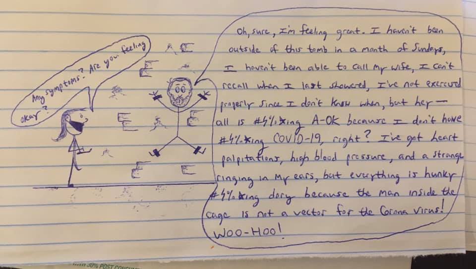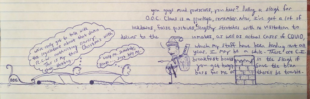 Just in case any part of our website has caused visitors to feel despondent, miserable, and/or jaded, we offer this page as a bit of comic relief. We will post hilarious and unintentionally hilarious material here as it comes our way. This page will also serve as a home for the comic strip Fog Line, by Washington prisoner Joey Pedersen. “Fog Line” is a term whose usage is a bit vague to us at WA Corrections Watch. It is a term used by WA DOC staff when even so much as a wisp of fog serves as grounds for locking prisoners down in their units or canceling prisoners’ access to scheduled outdoor recreation time. The term is referenced as a type of funded overtime post in this WA DOC 2015 Prison Overtime Usage report to the legislature (PDF pg. 10, report pg. 9).
