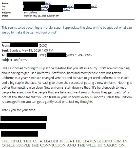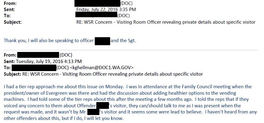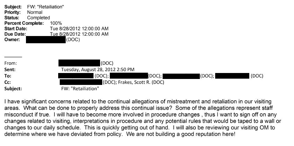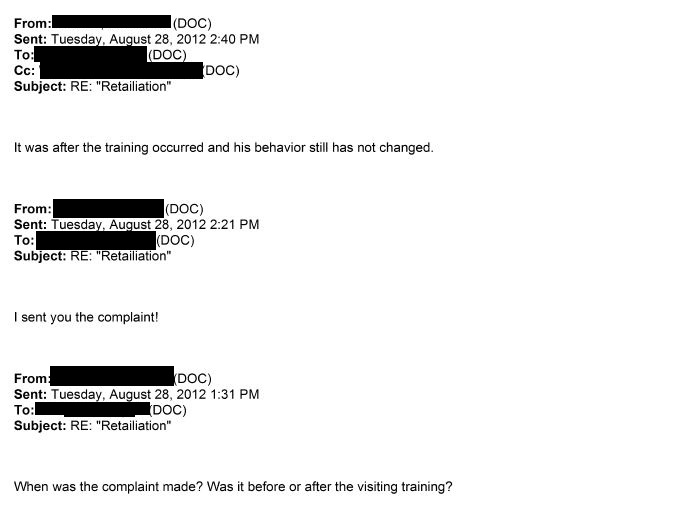 - August 2012 – One local facility WA DOC superintendent expressed concerns to WA DOC headquarters that staff were retaliating against visitors (see here and here)